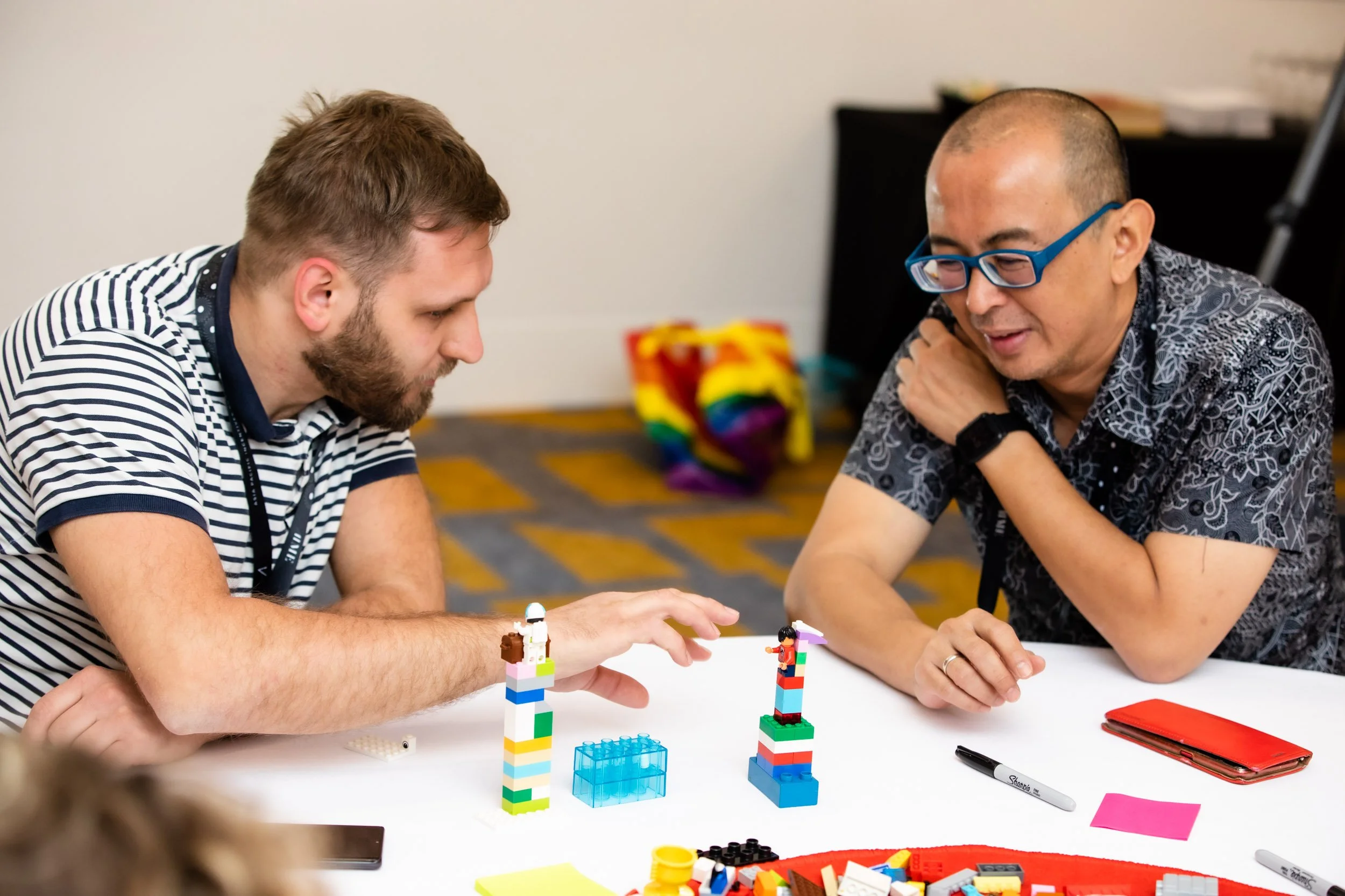 Two men sitting at a table playing with LEGO bricks, creating towers with small LEGO figures on top.